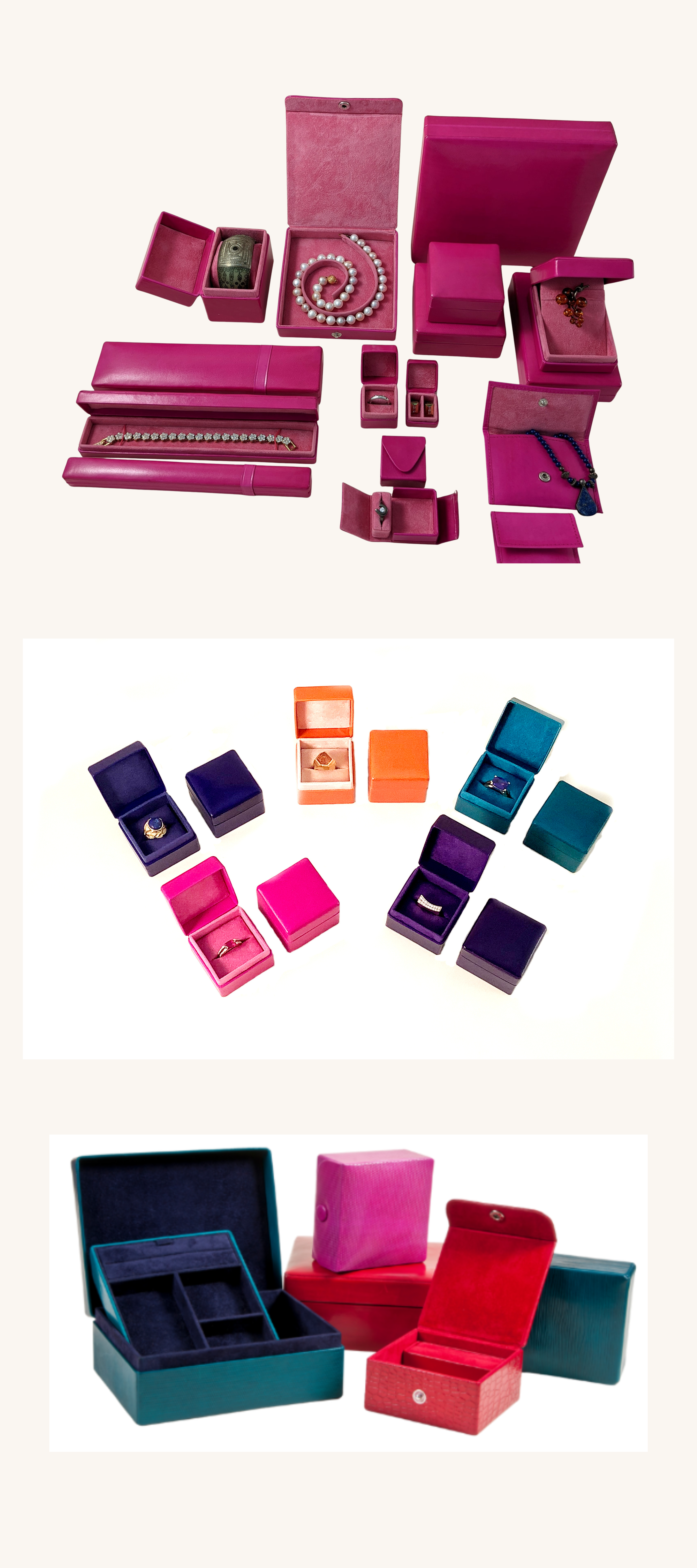 Yes. There is a 'standard' range of packaging developed to cover most jewellers' requirements, with sizes, colours, linings, and prices detailed in an information pack. Many box styles can be used for different jewellery pieces by interchangeable inserts.