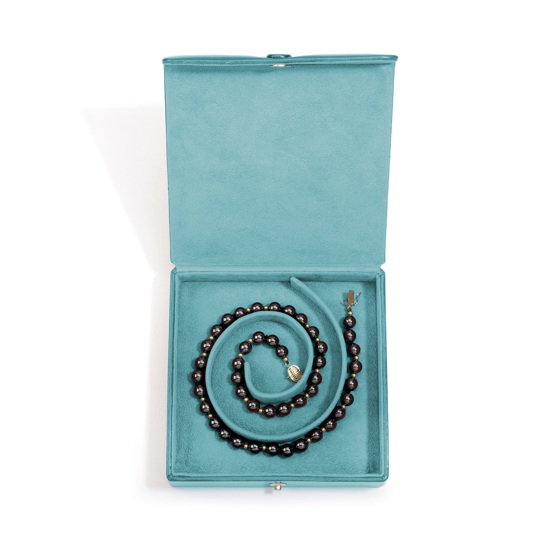 Present pearls and coil jewellery with refined elegance using this premium aqua coil presentation box, featuring a dedicated coil insert that securely showcases delicate designs. The smooth aqua leather exterior with plush polyester flock interior delivers a clean, upscale presentation for gifting, retail displays, or special occasions.