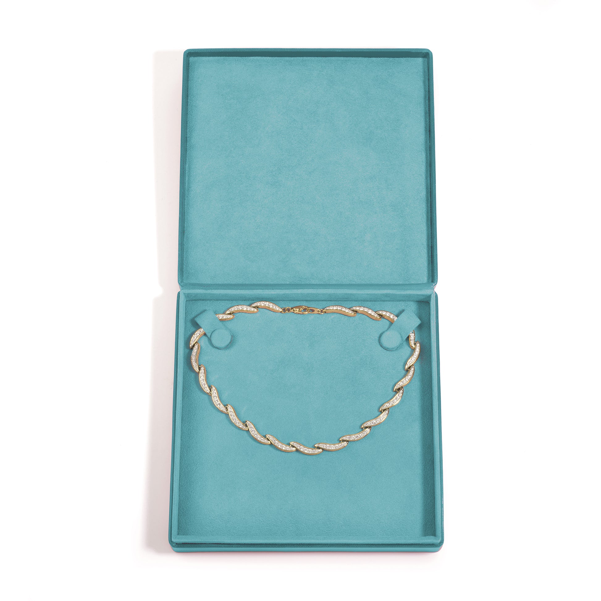 Present your necklaces with refined ease in this premium aqua necklace box, designed specifically to complement fine chains and statement pieces in a fresh, modern hue. Featuring a fixed 2‑stud strap pad, it keeps each necklace secure and neatly aligned, creating a clean presentation for wholesale clients or retail customers.