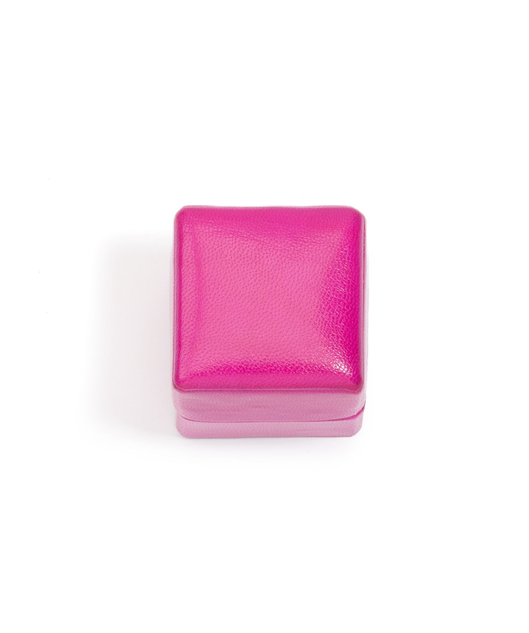 Present single rings with playful sophistication in our Smartie Box Large, featuring a fixed single ring insert with 1.75 x 1.75 cm split for secure hold. This compact fuchsia leather design offers a charming presentation for proposals, luxury gifts, or retail displays.